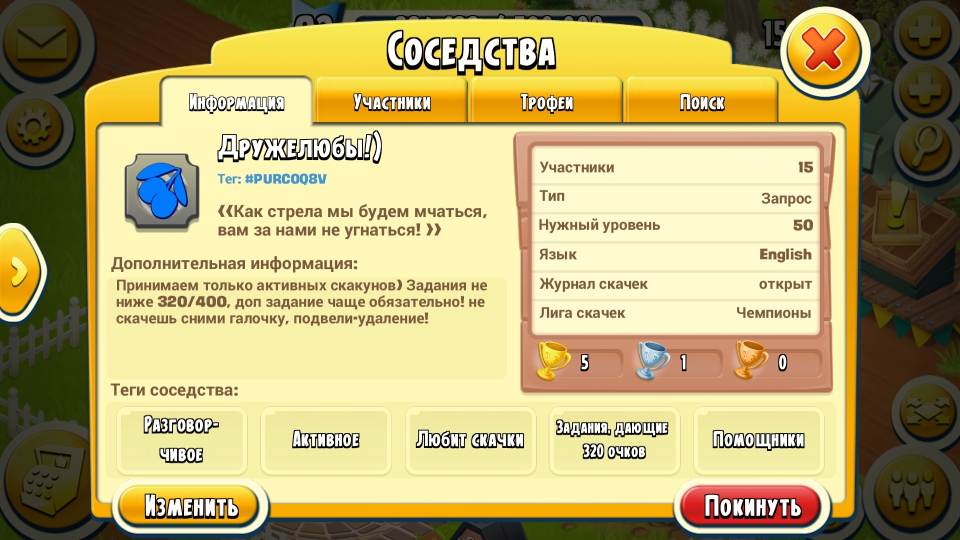 Добрый день) Приглашаем в свое самое дружное соседство.Всегда скачем в тройке лидеров, задания только 320/400,10е задание чаще обязательно.Если дела или занят-снимаем галочку) Подвёл-удаление! Возраст желательно 18+.Очень помогаем друг другу, общаемся, активные) Свой чат вацап для связи и общения о игре и не только))) Если ты ответственный, общительный скакун – ждем)