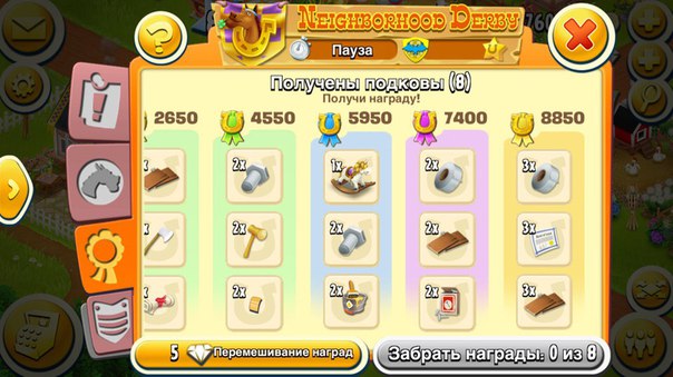 Ирина, после скачек за 5 алмазов перемещайте , там обычно много камней и призы норм приходят)