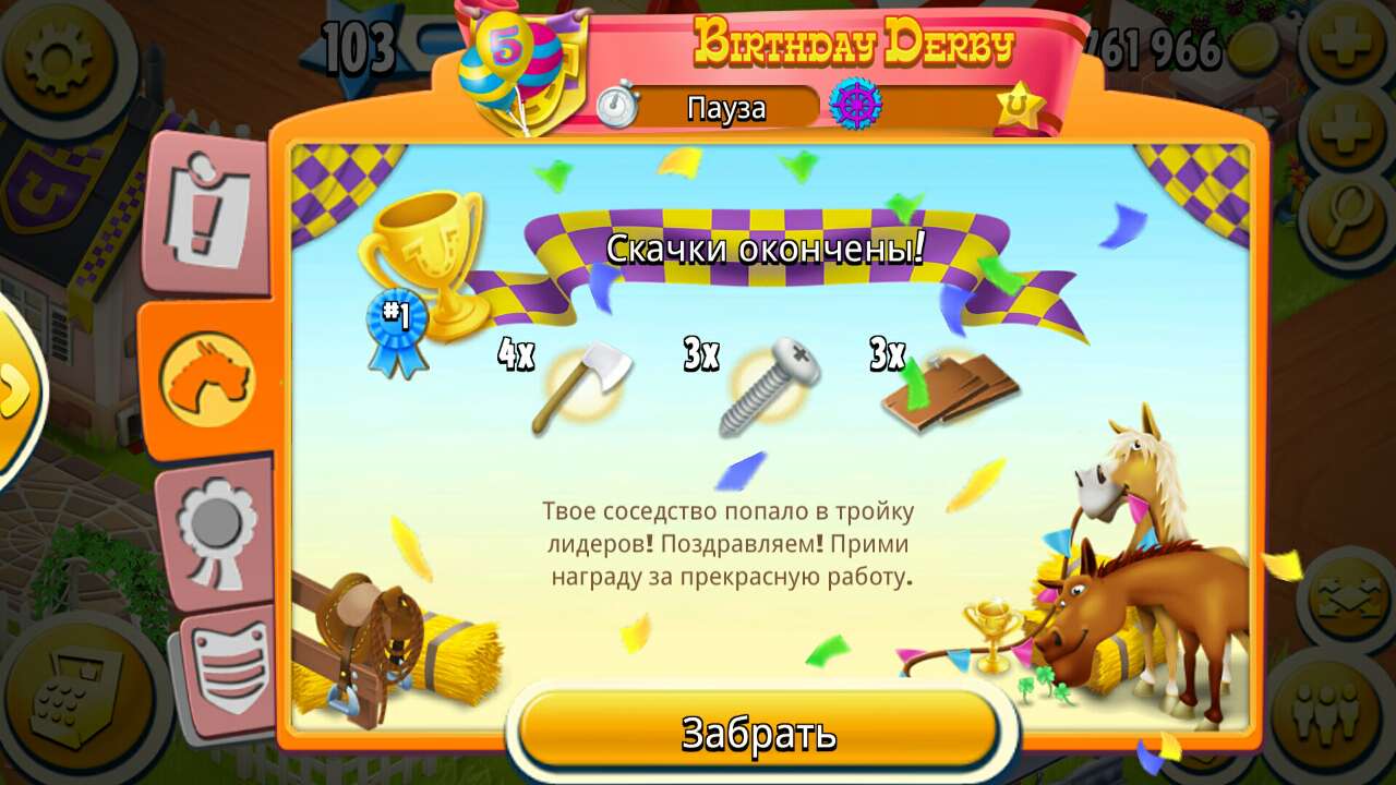 Также одно разочарование от этого дня рождения … Потратил 40 камней на перемешку и на загадочные сети , в результате ни жемчужины , ни чего то стоящего в подковах. .Даже свиток только один . За золото как обычно -строй да расширялки ..У всех в нашем соо награды ни чем не лучше ,чем в обычные скачки .