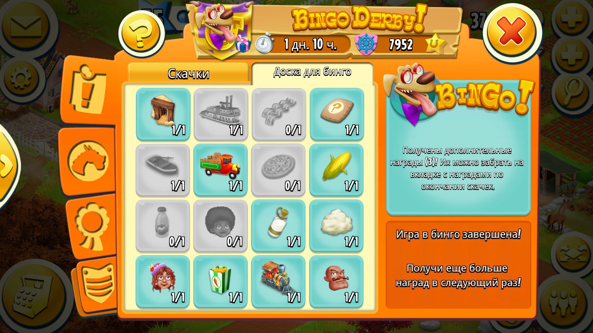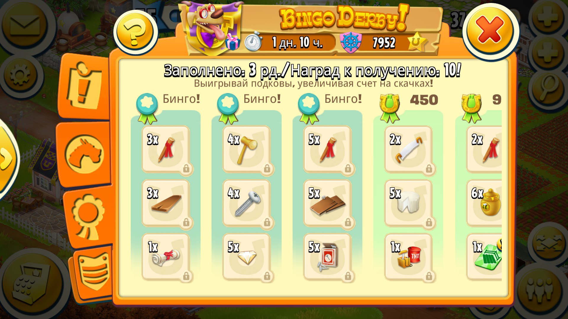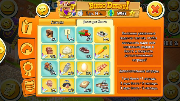 4 скачет по 1-2 заданий , но одно бинго сделали, очень редко задания из бинго и совсем маленькие дают, да и две клубники , два помидор, т.е. длинные очень задания по 2 , а они на конце линии, да и призы дрянь.