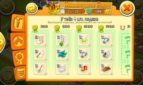 скачки просто ужас! задания кошмарные, долгоиграющие, да и по очкам мало 320 выпадает. Но самое интересное, то, как распределились для игры соседства – вместе с 30 и 40 уровнями играли с 130 и 180 уровнем, догадайтесь кто на 2 день забрал все призы? )) очень обидно как то…