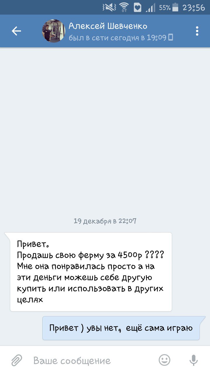 В нашем соо одна соседка хочет продать свою вторую ферму .. Сотый уровень , на счету и денег и камней хватает .Конфетка ! Просто на игру меньше времени стало и ей основной одной хватает!