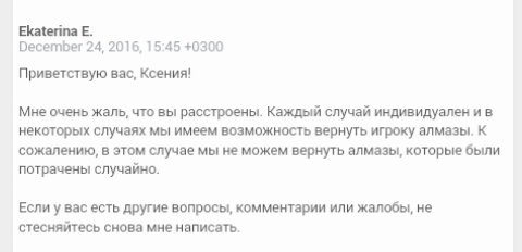 Алмазы возвращают не всем, смотря на что они были потрачены, дочь случайно 33 алмаза потратила. Написала в ТП мне сказали, что нужно следить за своими действиями и ничего не вернули.Возможно все зависит от уровня и количества оставшихся алмазов. Но попытка не пытка))) многие пишут что им возвращают.