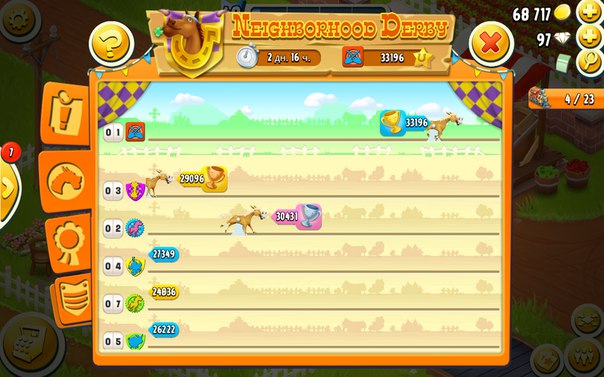 Наталья, хорошо ,заданий хоть завались,выбираю,какие хочу , меня никто не подводит, когда хочу ,тогда и скачу . Прошлые скачки скакала двумя фермами, тоже заняла первое место ,ну скакала дольше ..