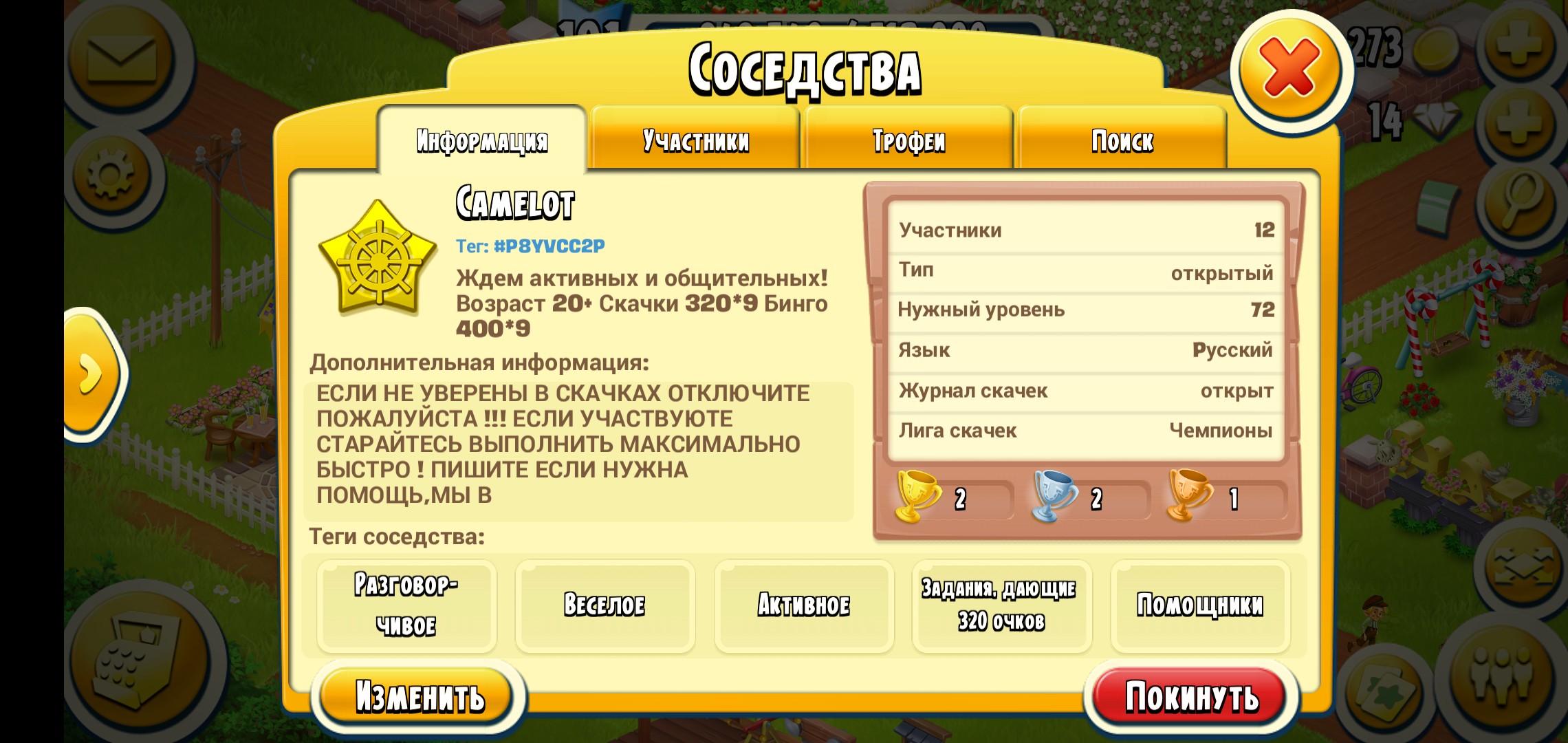 Всем привет ? Соседство «Кайф-сити 18+» ищет ответственных, сильных, активных и общительных скакунов ?, готовых занимать призовые места ???.,Возраст – строго 18+!!! О нас: Мы – активные и весёлые, общительные и ответственные, помогающие друг другу любители скачек ?. Всегда в тройке лидеров! У нас нет брони заданий, частый онлайн 24/7, также есть беседа в WhatsApp ?. Правила скачек: Обычные – 312+/9 Бинго – 312+/9 Тематические – 380+/9 Загадочные – 400/9 Цветущие – 320+ цветочки/9 , всегда сторого 9 заданий, во всех скачках, 10-е задание – по необходимости и при наличии алмазов решаем все вместе ! Заготовки приветствуются . Отложенный старт! Мы ждём тебя ?, если ты: активен, общителен, ответственен, готов помогать и любишь скачки ? также, как мы??, добро пожаловать к нам ??? мы обеспечим тебя всем будем помогать , общатся и занимать призовые места (безответственных, попрошаек, детей и не готовых скакать – просьба не беспокоить) если не ищет просьба при поиске выбрать язык в расширенных настройках любой