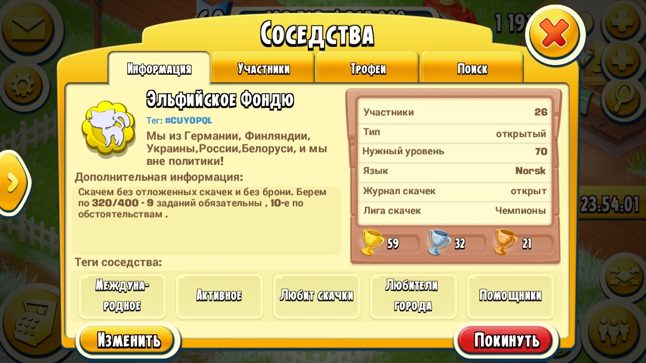 Приглашаем в наше тихое и дружное соседство, играем в удовольствие, скачем 9×320/400, алмазное берем, если есть возможность быть в тройке лидеров. Добро пожаловать, все вопросы в лс