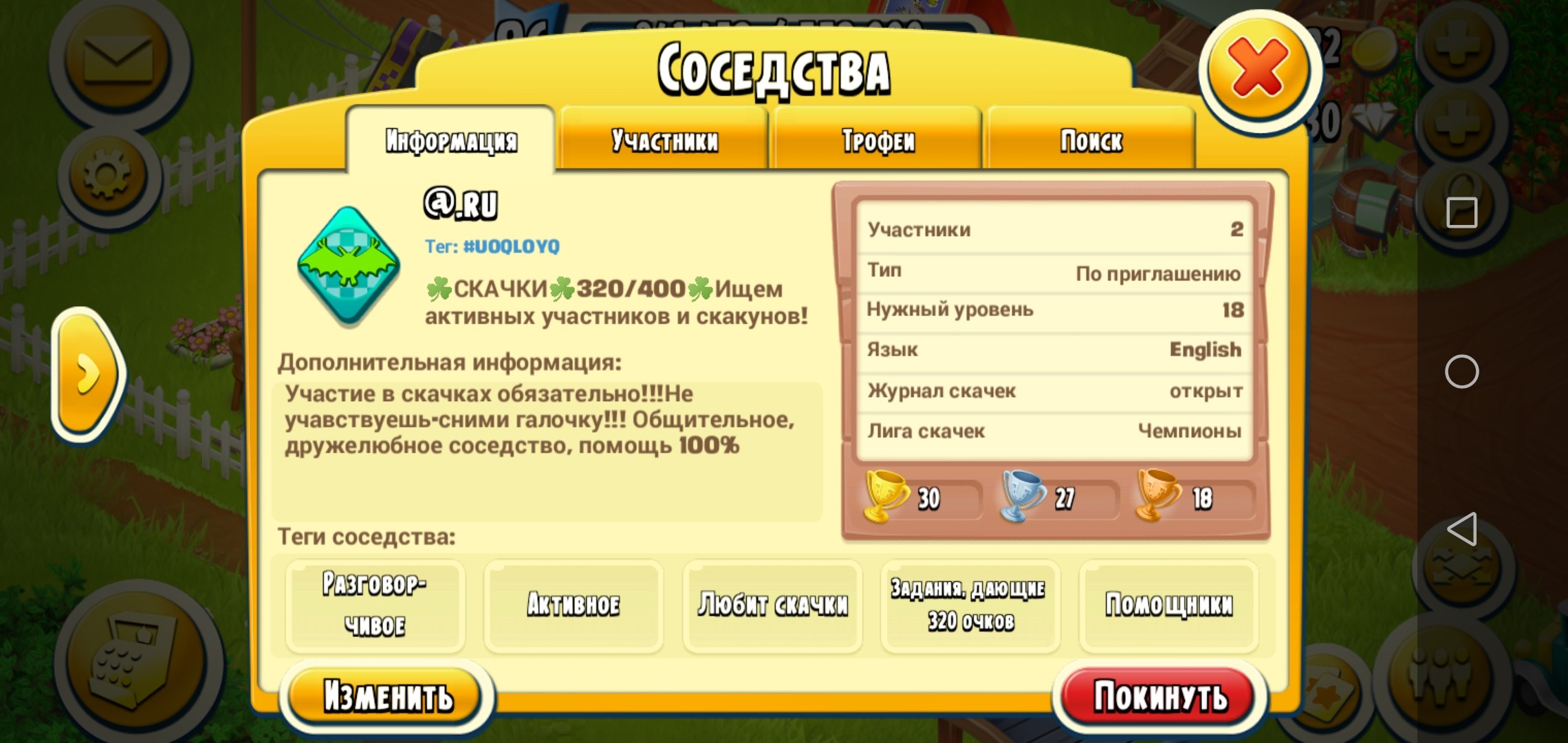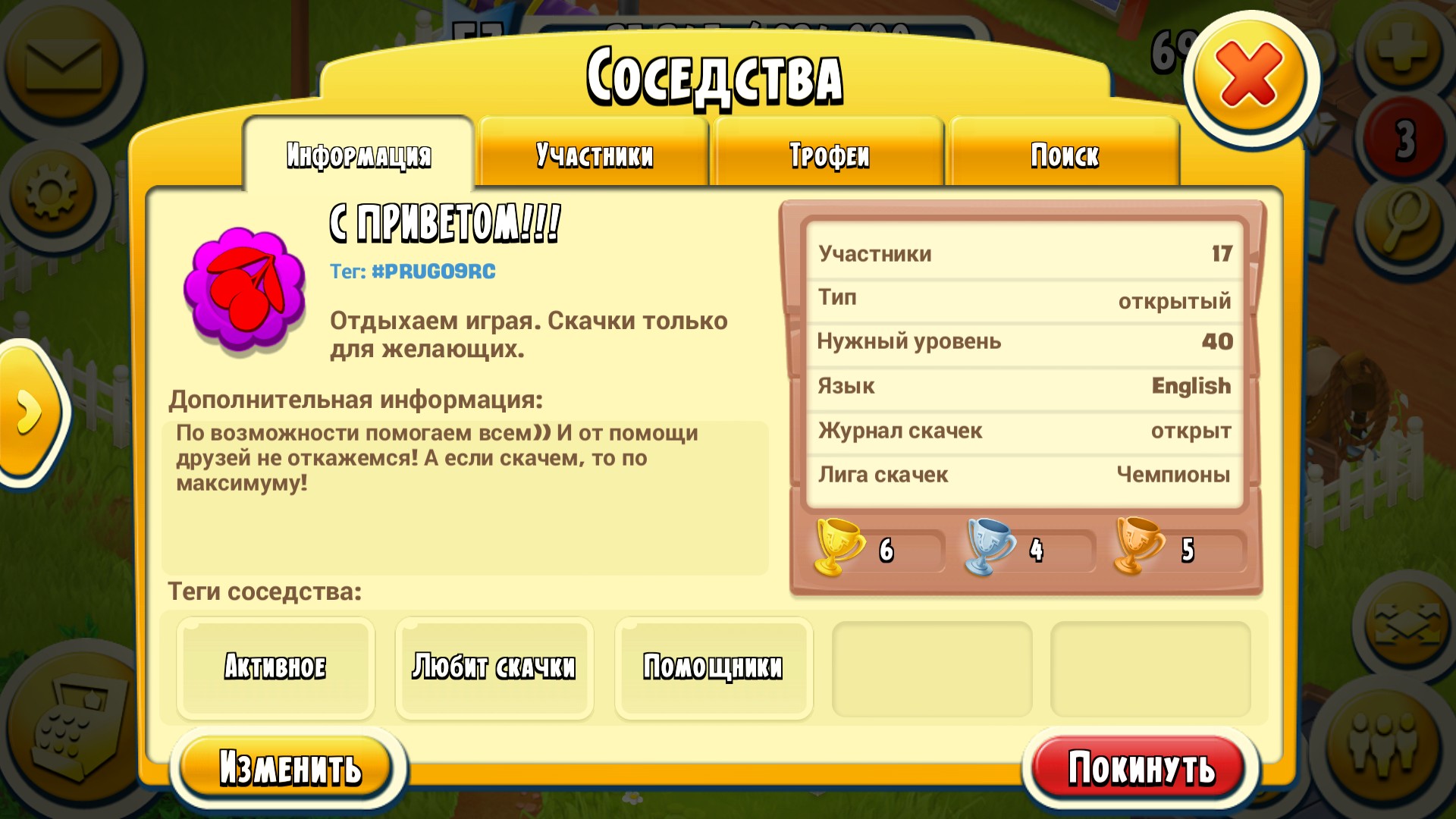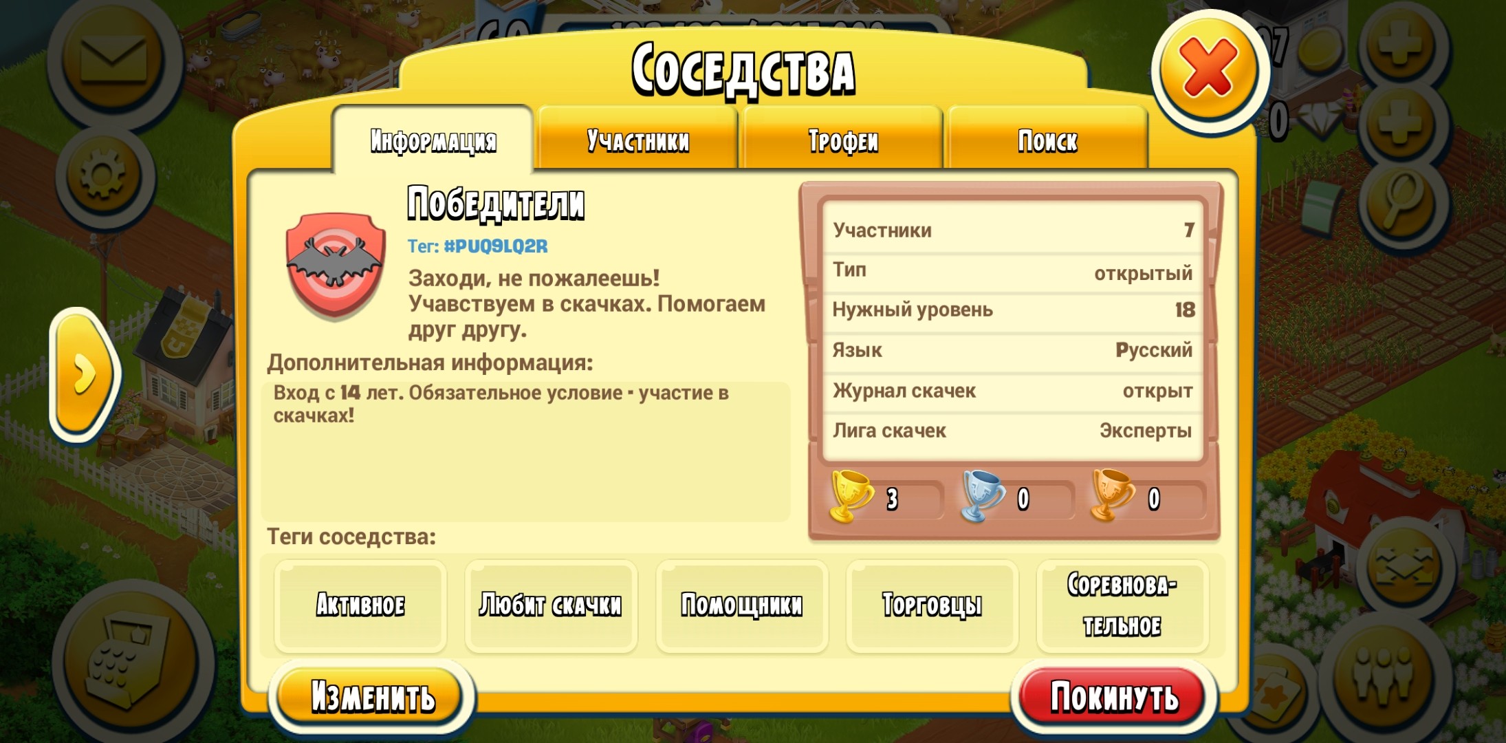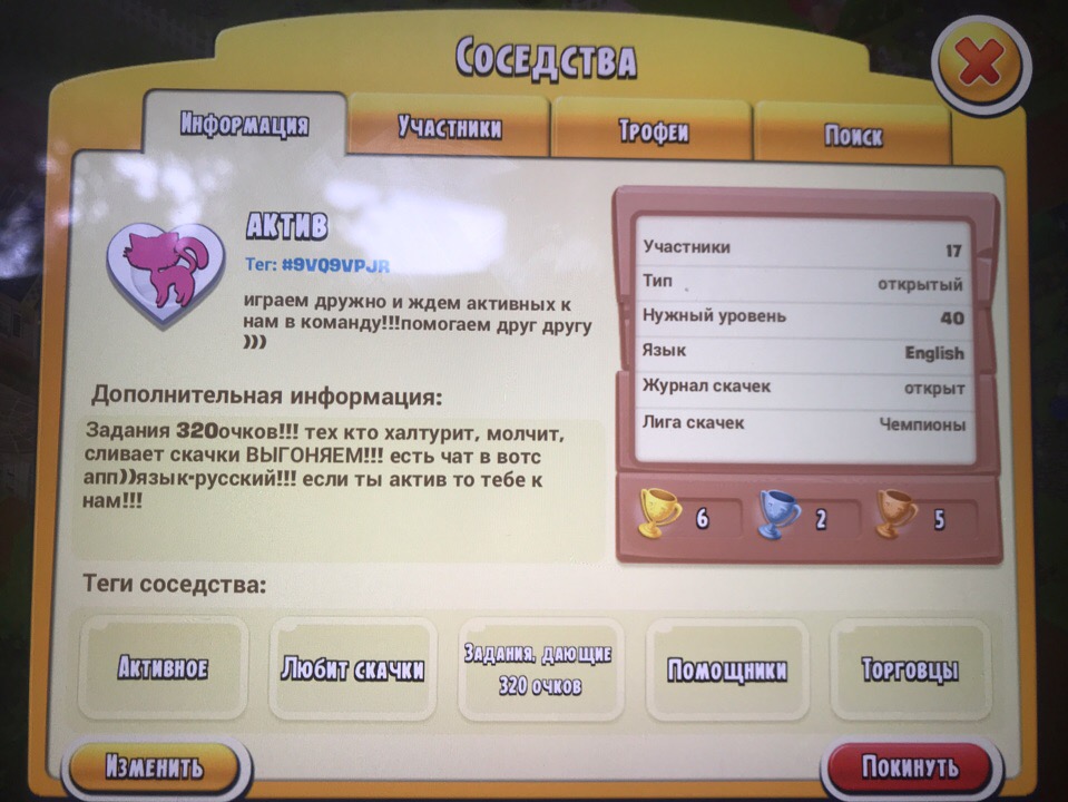 Приглашаем вас в дружное соседство, развиваться вместе с нами! Идём только за призовыми местами! Никогда не подведём, во всем поможем! Присоединяйтесь!рады всем, маленьким уровням поможем подняться))не скачешь-сними галочку, проблем нет) есть своя группа в вацапе для быстрой связи) ждём))