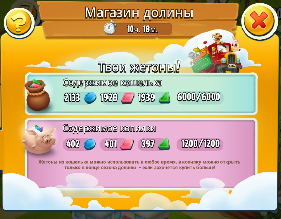 Alena, катарсис, два дня осталось, а я так и не могу прийти к консенсусу – фишки не желают находится нужные 🙁 сначала численный перевес синих, дождалась когда можно будет купить хоть что-то за синие, потратила 600, и вот, кажется ещё хуже сделала, теперь дофiга красных (это я их скостила только что – в магазине 500 потратила, скриншот запоздалый). И при этом совершенно не лезут зелёные , их сейчас всего 1500 с хвостиком? вожу животных по 10-15 в день, дают или по 50-100 зелёных, или вообще не дают, только синие и красные ? скупила пол магазина уже ?