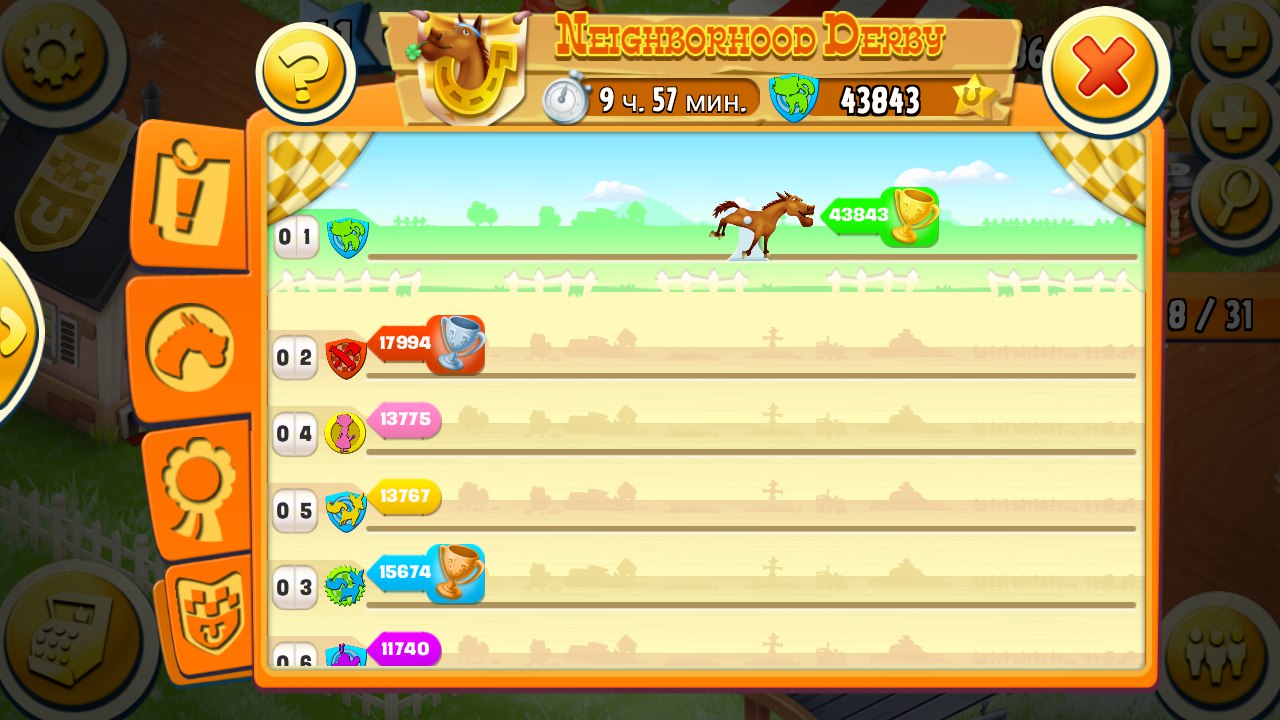 И мы,ребята,уже перестали пытаться попасть в тройку.нереально быстро делаются задания и все по 320.а у нас за это время не появляется и половины из того что те делают.писала разработчикам.пишут видимо те соседства избрали тактику действия за алмазы…каждый раз что ли?у нас даже как то одна играла девочка.и то не сумела попасть в тройку.я считаю нечестно ра предкляются задания.щас вон в конце скачек висят и город.и грузовики.и шахты.а вначале то где они???согласны?